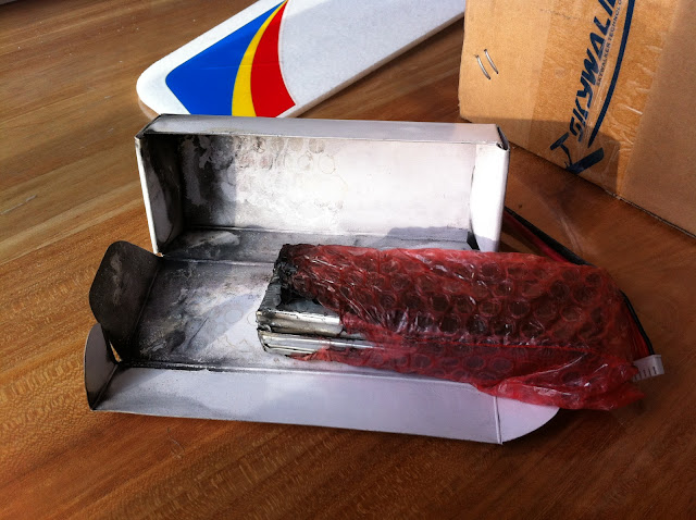 Hi, first I'd like to say thank you for the fast shipping. Skywalker arrived today, only 4 days very good. However, when I opened the box it was clear that there was something wrong. The smell from the box was awful, smelled like burnt plastic. When I eventually got to the skywalker fuselage I quickly saw that it was full of charcoal and the box containing the LiPo was damaged. I opened the box and this is what I found Also, one of the bullet connectors on the motor had come off. I think this has been packed up and been in storage for a long time, from experience it's not good to store LiPo's in this manner and the damage could have been worse. Thankfully the plane itself is in good condition and the charring was easily wiped clean. Please could you arrange for partial refund to allow me to purchase a new LiPo battery and some bullet connectors so I can resolder the motor wires. Many thanks